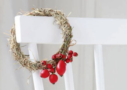 Dekoracja o sielskim naturalnym uroku to propozycja na jesień. Pozwoli nam w subtelny sposób wyeksponować to, co o tej porze roku cieszy oko w ogrodzie lub parku – dary jesieni. Czerwone korale, ozdobne dynie czy tykwy wkomponowane w wianek suchej trawy.