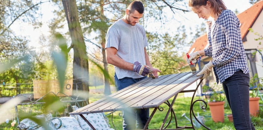 Chcąc przemalować drewniane meble lub elementy małej architektury ogrodowej, stwórzmy taką atmosferę, by praca ta stała się przyjemnością nie tylko dla nas, ale innych członków rodziny, których w nią wciągniemy. Nie musimy pomalować wszystkiego w najbliższy weekend – prace możemy rozłożyć na następne, przecież długie lato przed nami, a  na działce nigdzie nam się nie spieszy! Jednak zabawa zabawą, pamiętajmy także o  odpowiednim przygotowaniu podłoża – stare łuszczące się po - włoki na drewnie trzeba najpierw dokładnie usunąć, powierzchnie od - tłuścić, wysuszyć i  dopiero potem malować.